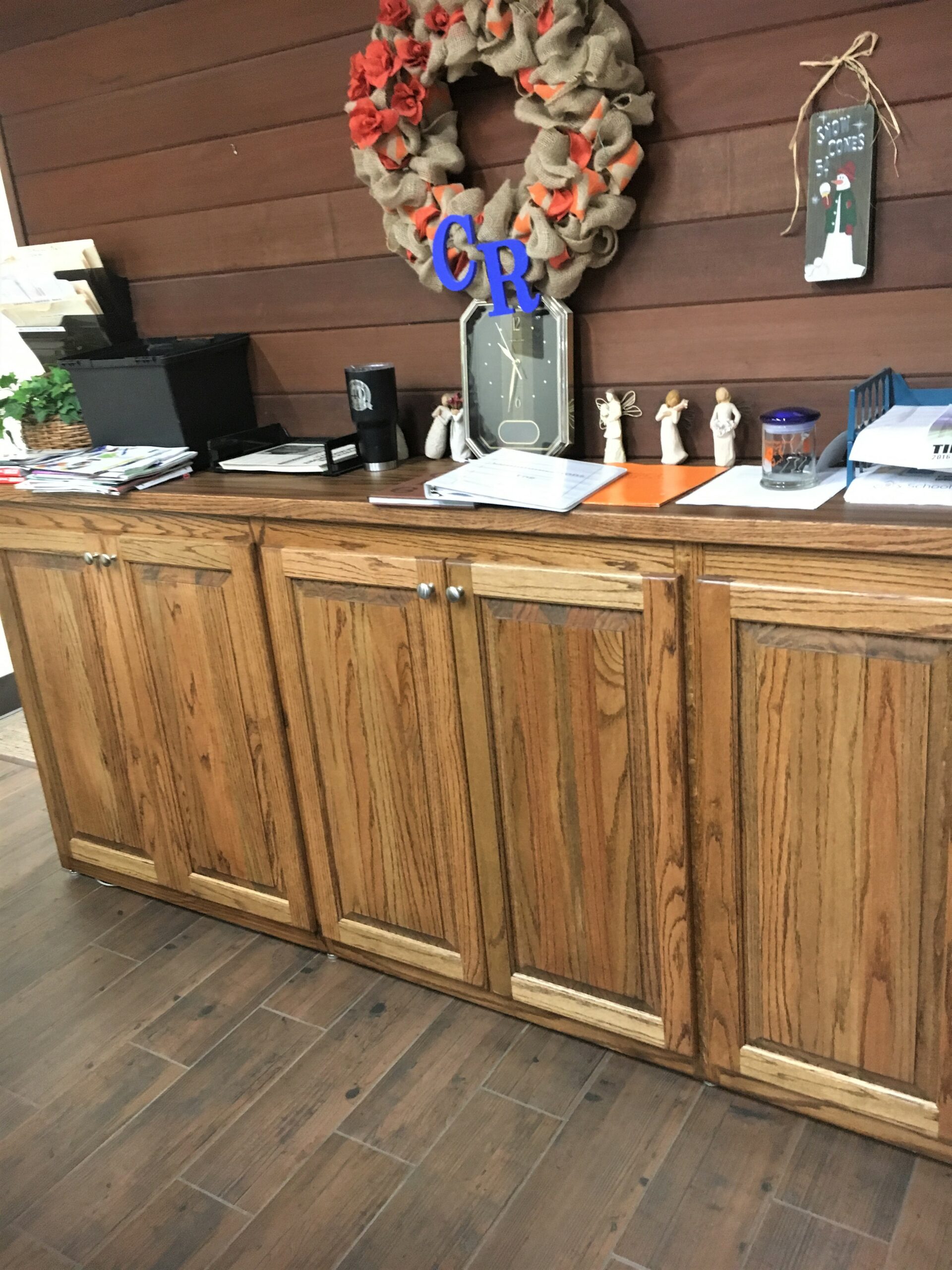 All furniture items are constructed of solid oak and cabinet grade plywood. Select models also include integrated metal. All tops are made with high pressure wood grain patterned laminate, while doors, if so equipped, and are a solid oak raised panel design. Our entire line of furniture carries a lifetime warranty against defective materials and workmanship (unless purchased second hand). Lifetime warranty is only good for original purchaser.