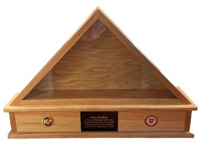 Displays burial flags given to families of Veterans & Law Enforcement. Cases are made of oak with a Lexan front and removable oak back. 17″ high x 25″ wide x 5″ deep. Challenge coins can be added.