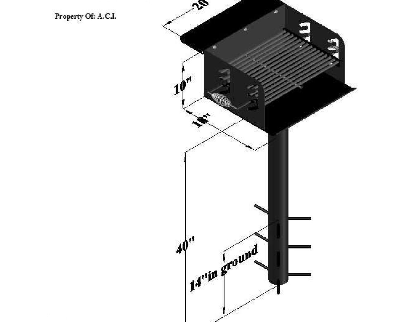 Park BBQ Grill 18″ Depth, 20″ Width, 10″ Height. Mounting Pole 40″ L. 11 ga. high heat black paint.