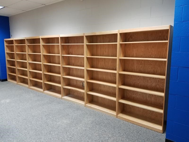 See several bookcases lined up.