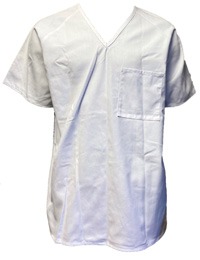 White jail tops are 65% Poly, 35% Cotton twill. They are V-neck (no collar), with short sleeves and a pocket on the left front.